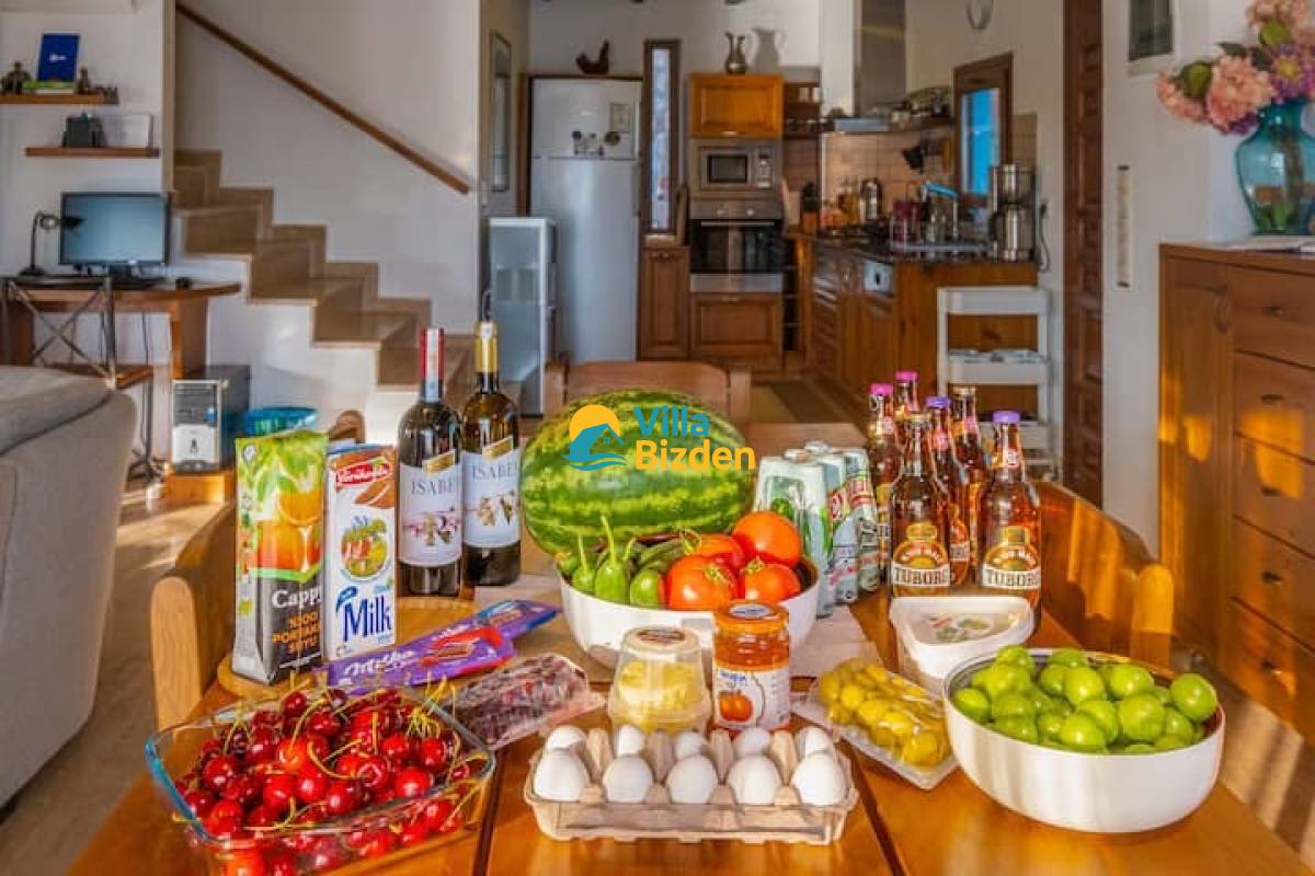 Bira (6 'lı paket), x6 maden suyu, süt, meyve suyu, yumurta, tereyağı, reçel, zeytin, peynir, çikolata, domates, salatalık, mevsim meyveleri, sıcak/soğuk su sebili için ekstra su ve çay, kahve, filtre kahve, Türk kahvesi, tuz ve biber, şeker ve zeytinyağı gibi temel malzemeler sağlanmaktadır.